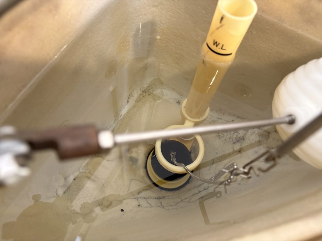 あまり大掛かりな作業ではなさそうなので、もしかしたら自分でできるかもしれない、とタンクの中を見てみると、やはりレバーの先にぶら下がっているチェーンの先がなく、だらんとしています。どうやら、排水の弁となるゴム玉と繋がっているはずの部分が外れている感じ。
